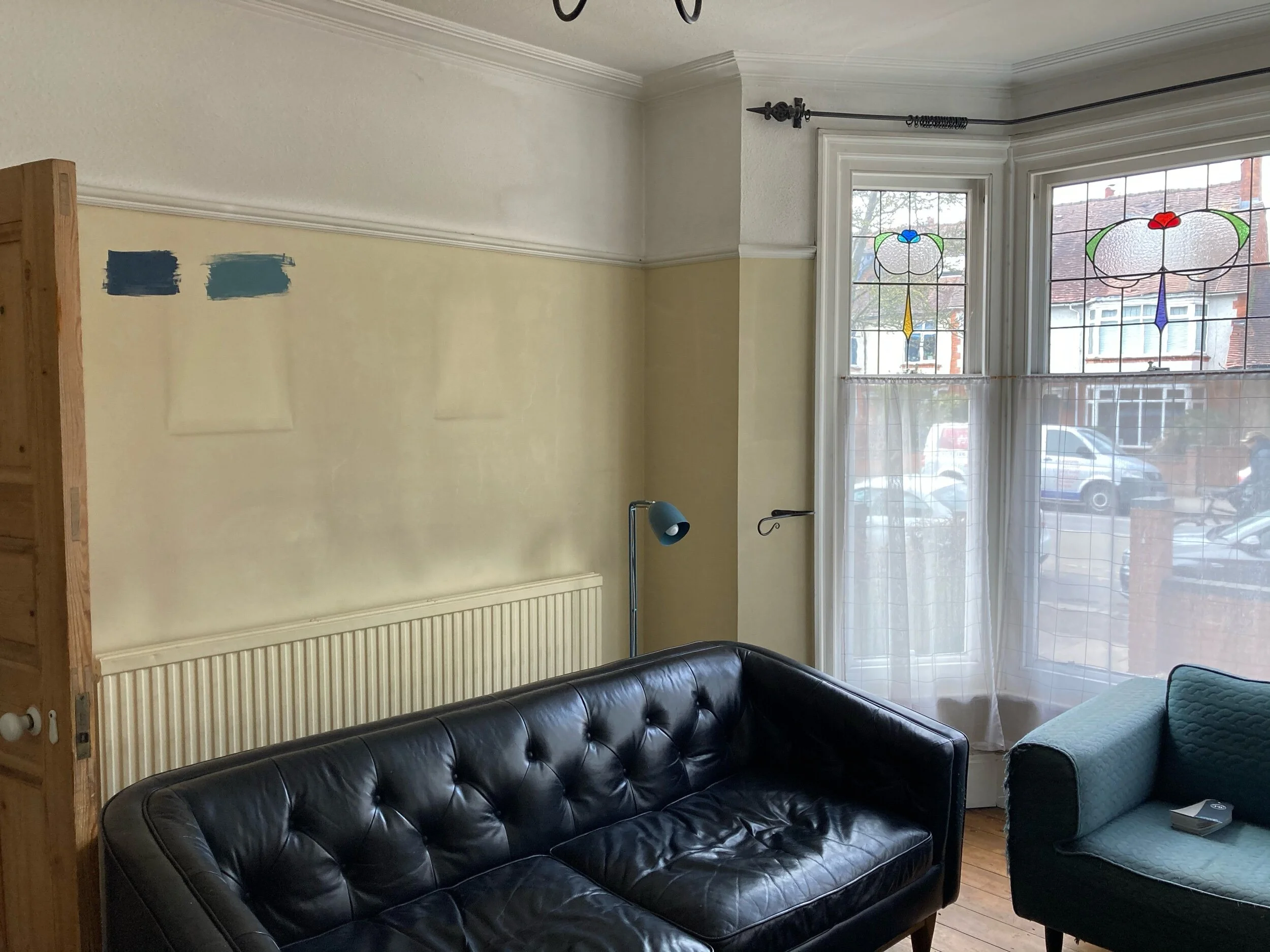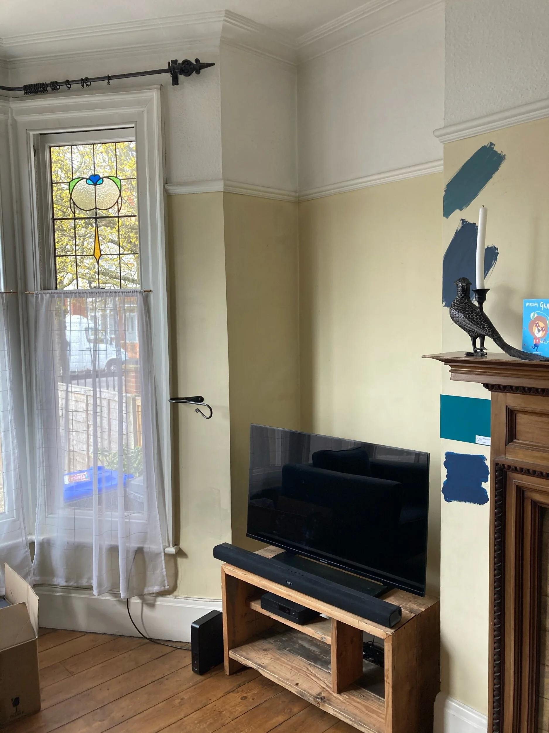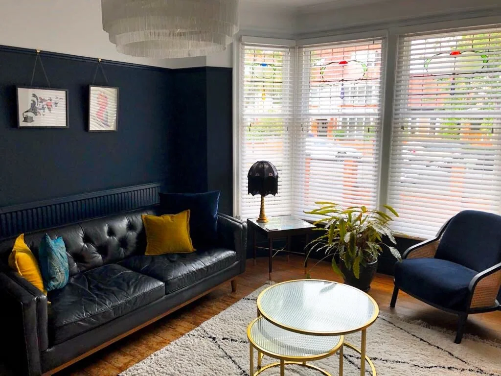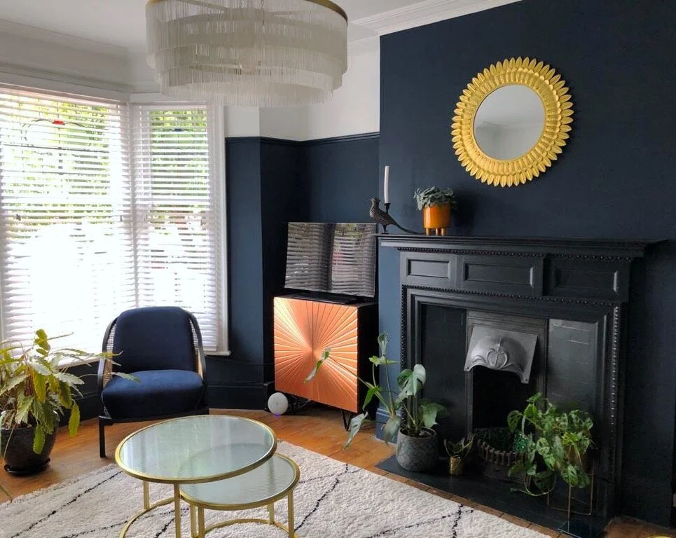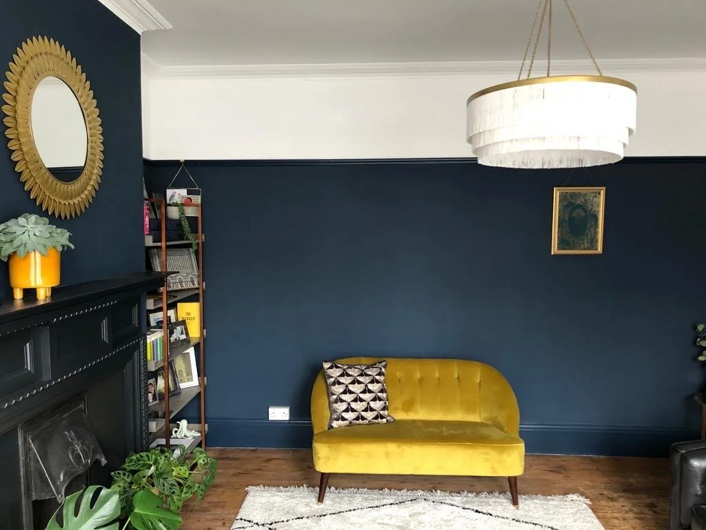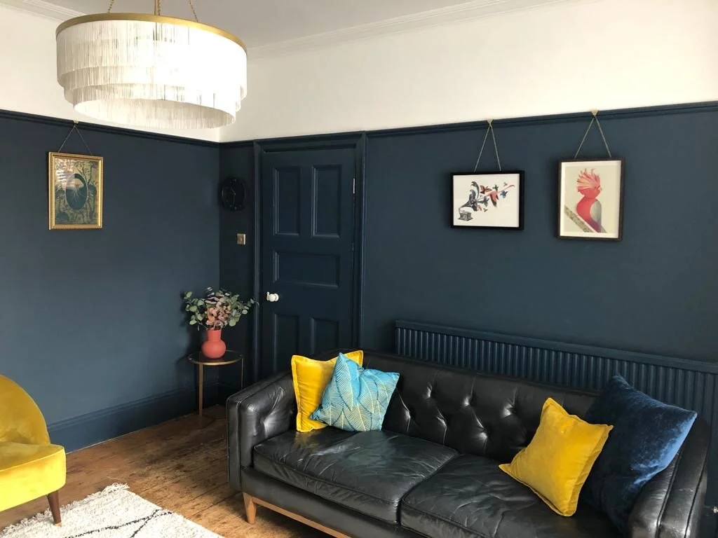 My clients C&T had recently moved into their bay fronted Edwardian Terrace and had quickly got to work refreshing the rather neglected interiors, however they really wanted some guidance with what was to be their family living room. They knew that they ideally wanted blue as the main colour however too many hours on Pinterest and 20 tester pots later and they had become overwhelmed and totally confused about the direction they should go in. They were also worried about making the room too dark and we’re beginning to lose their confidence of working on a bold design. I visited them at their home to not only take a look at the space but also to understand C&T’s style better. It was definitely a worthwhile visit as the photos they had previously sent to me of the room didn’t show the wood chip which ran from the picture rail and over the ceiling. C&T explained that they were on a strict budget for the room and they were worried about the cost of removing the wood chip but after discussing it together I explained that the investment would definitely pay off in terms of end results and longevity. To help them make the decision I put them in touch with my local decorator so they could gain an estimate and speak over the work in more detail from which they decided to go ahead and I’m pleased to say they are really happy they did!