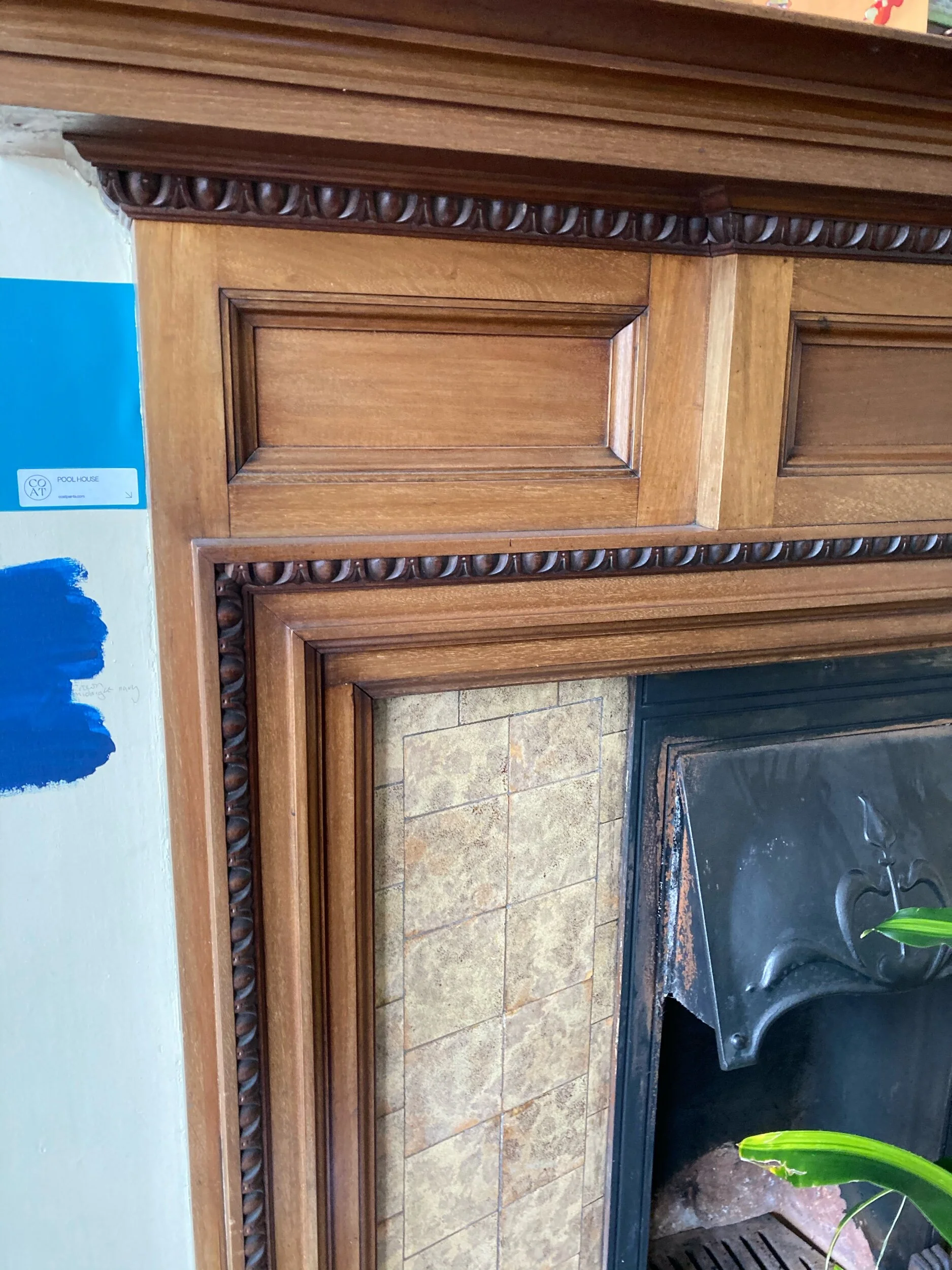The huge fireplace also needed an update with the beige 70’s tiles and the issue with too much wood in the room from the surround, floor boards and pine door. For a quick fix the wooden surround was painted in Farrow &Ball’s Railings and although replacement tiles were sourced C&T were happy to paint over the existing tiles in Railings too for an instant and affordable alternative which looks very effective. To combat the rest of the wood issues a large area rug was selected for the floor to give a cozy feel and I recommended that the pine entrance door should be painted the same colour as the walls. (You can also see from the below the skirtings, picture rail and radiator were all painted blue too for a seemless feel).