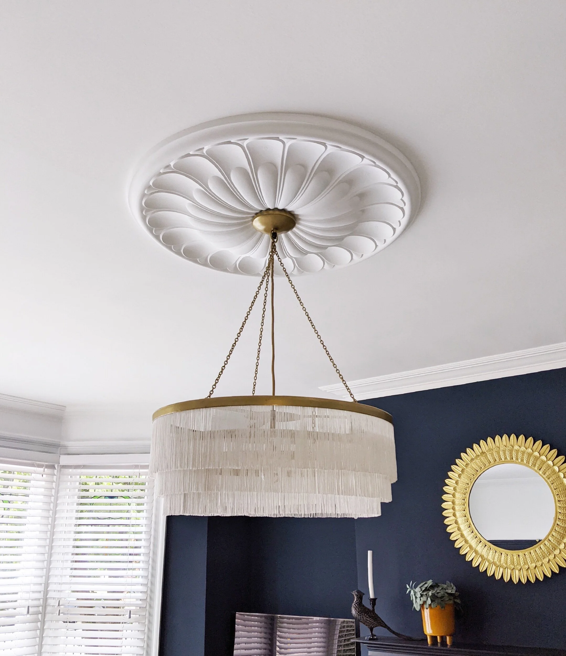 Apart from the removal of the wood chip my big insistence for the room was to bring character back to the ceiling by adding a statement ceiling rose and chandelier. I recommended this beautiful rose from Plaster Ceiling Roses finished with a fringed chandelier from Rockett St George which has helped to transform the room and give the eclectic feel my clients were after.